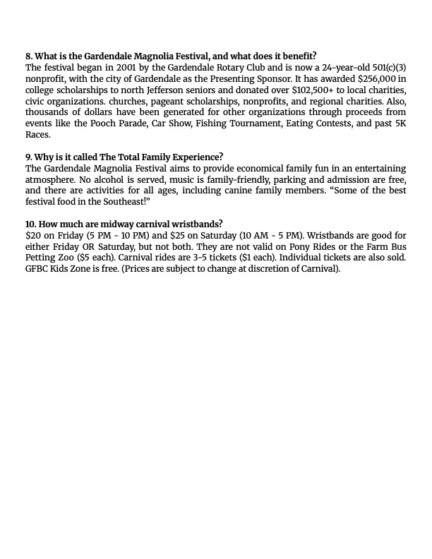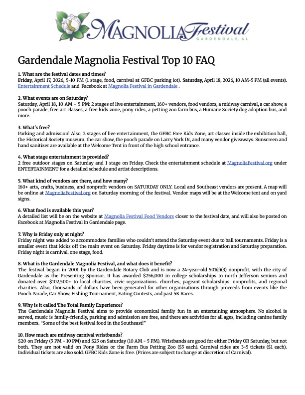 The Annual Gardendale Magnolia Festival is an award-winning, family-friendly event held at the Gardendale Civic Center complex. Our mission is to provide visitors with an economical, family-friendly experience while promoting local businesses, tourism, local arts and culture, and volunteerism in the greater Gardendale area. We have over 160 vendors, 2 stages of live entertainment, a pooch parade, midway-style carnival, car show, free kid zone, petting zoo/pony rides and more!